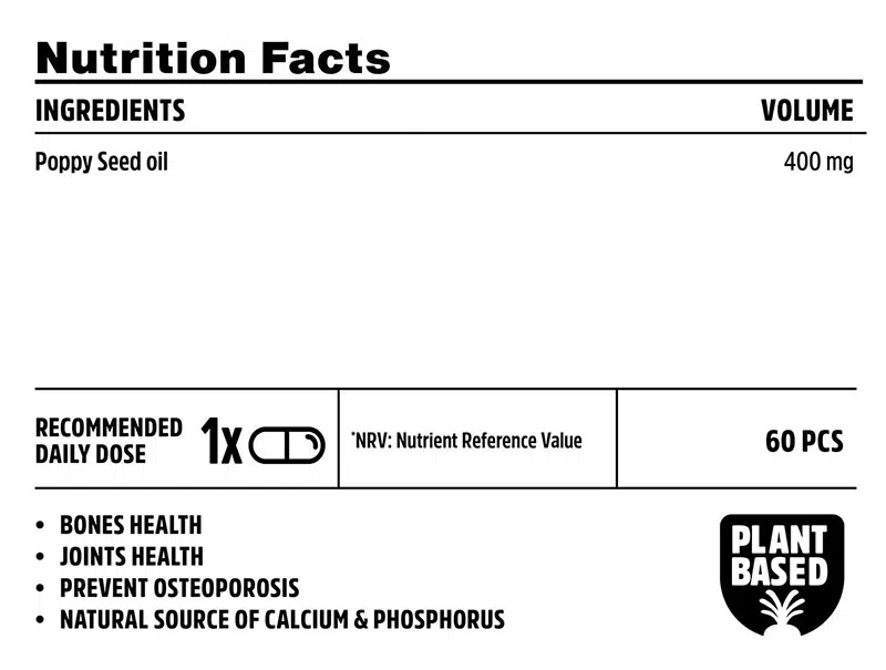 Its main effect is due to its organic calcium content. Also rich in Omegas (Omega-6 content is cca. 60-65%), vitamin-B6, -E, iron, magnesium, phosphorus. Organic phosphorus supports the incorporation of natural, organic calcium into the bones and joints. For thousands of years poppy seed oil is a well-known traditional medicine prevents osteoporosis. Its latin name is Papaver somniferum, means âdream bringerâ refers to its stress reliever and sleep calming effects.